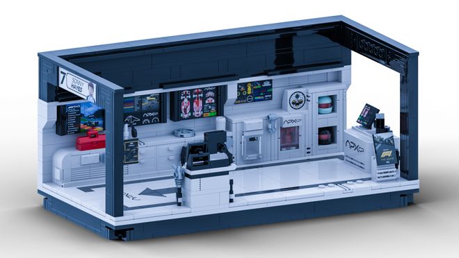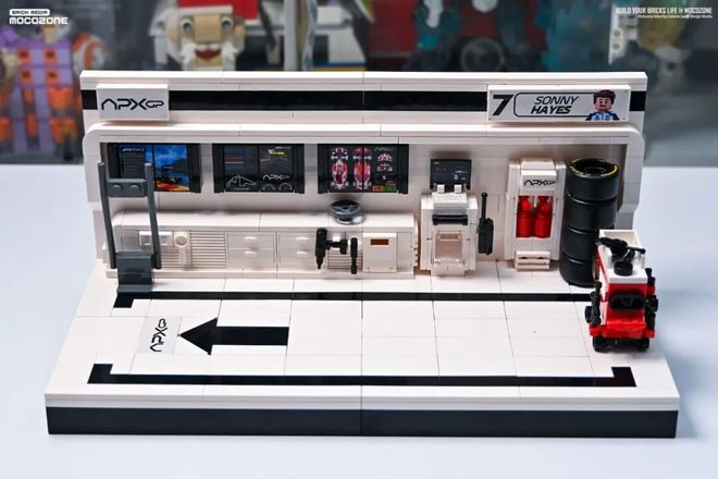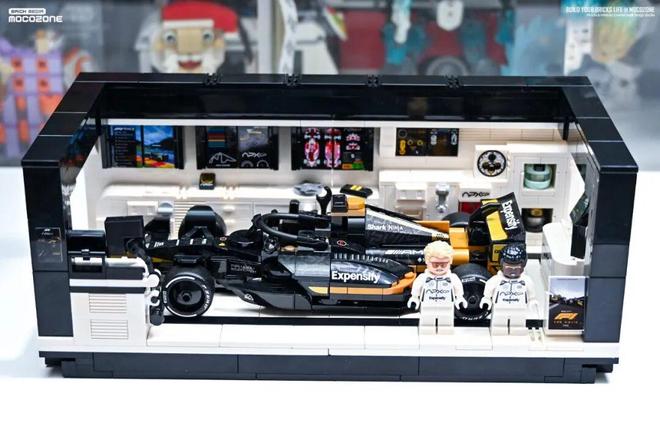 场景内专门设计了人仔的站立位置,以及赛车头盔的摆放位置,包括多余的零件也都单独设计了摆放的按插位置,当然,你想让场景更丰富,也可以自己再添加一些小细节。
