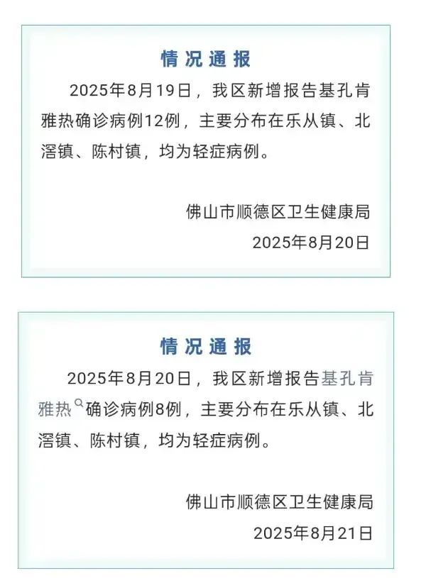 据佛山市顺德区卫生健康局发布的情况通报,8月19日、20日顺德区新增报告基孔肯雅热确诊病例均为轻症病例。