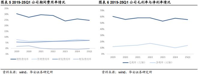 公司费用管控能力强。2019年-2025年一季度,公司销售费用率趋势持续向下,管理费用率、研发费用率基本保持稳定。2025Q1,公司销售费用率为24.63%,毛利率为55.36%,净利率为13.70%。