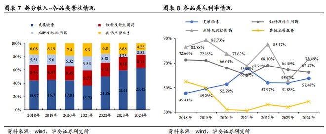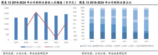集采影响基本消化,制剂业务已逐步恢复。2024年制剂业务实现收入24.15亿元,同比增长6.02%。具体看,1)妇科计生类制剂产品销售收入4.46亿元,同比持平。主要系庚酸炔诺酮注射液、屈螺酮炔雌醇片、戊酸雌二醇片等新品种放量弥补黄体酮胶囊因集采下滑。2)麻醉肌松类制剂产品销售收入1.55亿元,同比增长55%。增长迅速主要得益于罗库溴铵注射液等集采后恢复性增长及新品舒更葡糖钠的快速放量。3)呼吸类制剂产品销售收入8.8亿元,同比增长31%,主要系核心品种糠酸莫米松鼻喷雾剂的较快增长。4)皮肤科产品2.34亿元,同比增长19%;5)普药制剂产品销售收入5.48亿元,同比下降19%,下滑主要受部分制剂产品纳入省级联盟集采所致。