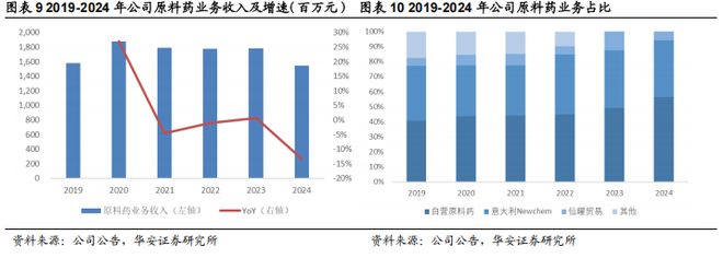 从业绩看,2024年原料药业务受汇率、客户去库存、需求疲软等多因素影响,收入有所下滑。2024年公司原料药及中间体销售收入15.47亿元,同比下降13.4%。其中主要自营原料药销售收入8.7亿元,同比下降1%,整体保持平稳,主要系原料药非规范市场竞争加剧,市场价格下降明显,但市场份额提升;意大利Newchem销售收入5.86亿元,同比下降13.08%,主要受欧美市场需求疲软等因素影响。