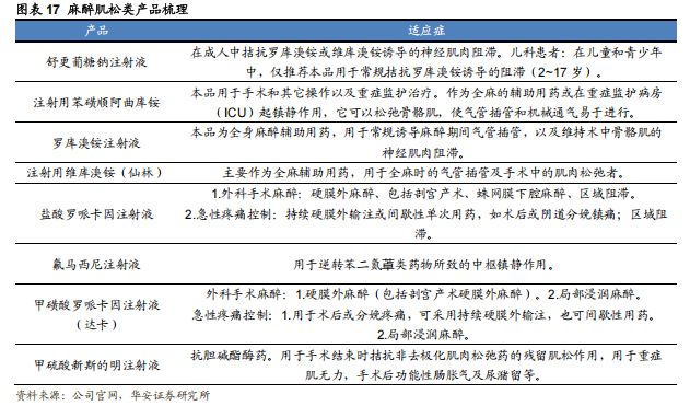 麻醉与肌松类药物(制剂)包括舒更葡糖钠注射液、注射用苯磺顺阿曲库铵、罗库溴铵注射液、注射用维库溴铵、甲磺酸罗哌卡因注射液等。主要用于外科手术麻醉、急性疼痛控制等。