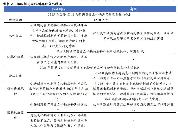 同杭州奥默共同开发1.1类创新药奥美克松钠,十年合作即将进入收获期。2015年12月17日浙江仙琚制药股份有限公司与杭州奥默医药股份有限公司签署《1.1类新药奥美克松钠产品开发合作协议》,协议金额为6500万元,双方约定同意就奥美克松钠产品进行独家合作开发。双方共同拥有奥美克松钠的原料和制剂临床批件、新药证书。2021年4月20日,仙琚制药发布《关于签订产品开发合作补充协议的公告》,由于药品注册申请规则变化,与杭州奥默经协商签署了《1.1类新药奥美克松钠产品开发合作协议之补充协议》,决定由杭州奥默作为奥美克松钠制剂的药品上市注册申请人,向国家食品药品监督管理部门提出药品注册申请,并在取得药品注册证书后成为药品上市许可持有人。奥美克松钠原料药批准文件由仙琚制药持有。奥美克松钠制剂取得上市许可后,将在中华人民共和国境内与仙琚制药开展独家合作。仙琚制药支付奥美克松钠及制剂产品临床研究等前期开发费用至2021年3月31日止(已累计研发投入约人民币8653万元),自2021年4月1日起奥美克松钠制剂的后续开发、申报费用由杭州奥默承担。开发申报过程中委托仙琚制药提供的制剂样品、原料药及技术服务,由杭州奥默按市场公允价格向仙琚制药支付相关费用。产品获批后,奥美克松钠原料药及制剂的生产由仙琚制药独家生产;同时,奥美克松钠制剂在中华人民共和国境内(除浙江省、广东省、山西省、新疆和西藏自治区5个区域外),由仙琚制药进行独家销售。目前奥美克松钠注射液处于申报审批阶段。
