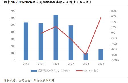 罗库溴铵注射液集采影响已基本消化,舒更葡糖钠纳入第十批集采但整体影响有限。罗库溴铵注射液收入占比相对较高,2021年销售占公司总收入的10.35%,该产品中标第七批国家集采并于2022年第四季度开始执行,降价幅度约为74%,因此2022、2023年麻醉肌松板块严重承压。2024年麻醉肌松类制剂产品销售收入1.55亿元,同比增长55%,得益于罗库溴铵注射液集采后的恢复性增长,以及新品舒更葡糖钠注射液的快速放量。