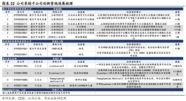 此外,公司参股子公司布局完善,涉及原料药、中间体、耗材、设备、保健品、创新药等等。其中公司参投的创新药公司,布局管线丰富,部分管线进展较快。