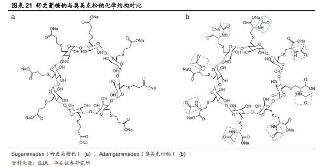 奥美克松钠获批在即,产品放量未来可期。奥美克松钠是靶向性肌松拮抗剂,是罗库溴铵注射液的拮抗剂。奥美克松钠主要作用为在全麻手术中逆转不同浓度罗库溴铵、维库溴铵诱导的神经肌肉阻滞作用。根据《骨骼肌松弛药临床应用专家共识(2024)》指出,目前临床常用的非去极化肌松药拮抗剂包括胆碱酯酶抑制剂(新斯的明)和舒更葡糖钠。