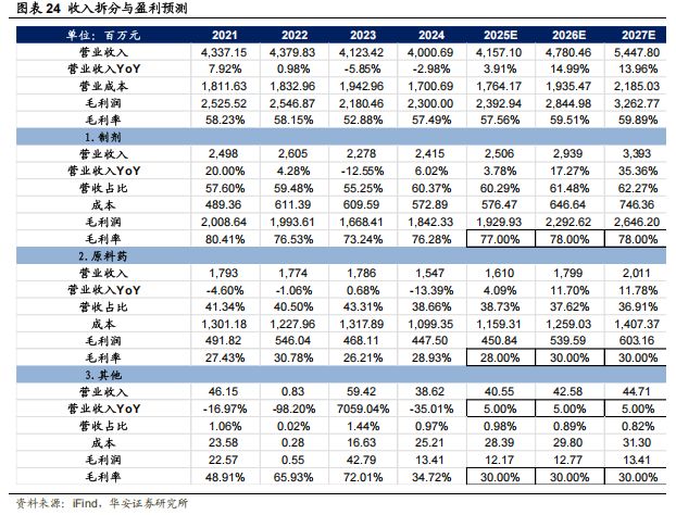 考虑到 1)制剂业务集采风险陆续出清,已获批新品种如庚酸炔诺酮、屈螺酮炔雌醇片、戊酸雌二醇片、地屈孕酮片等快速放量;2)原料药业务客户去库存陆续结束,需求端开始恢复性增长;3)在研品种将陆续取得新进展,如1.1类新药奥美克松钠、黄体酮凝胶等,有望为公司后续增长贡献新增量。因此我们综合预计公司 2025-2027 年营业收入增速分别为3.91%、14.99%、13.96%。具体假设如下: